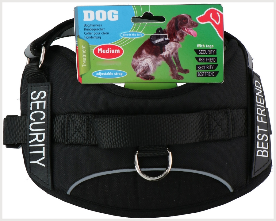 Fényvisszaverő szalagokkal rendelkezik, amelyek jól láthatóak amikor sötétben sétáltatod kutyádat. Kapsz két címkét, melyeket tépőzárral rögzíthetsz a heveder két oldalán. Az egyik készleten a „Best friend”, a másikon „Security” felirat szerepel.
