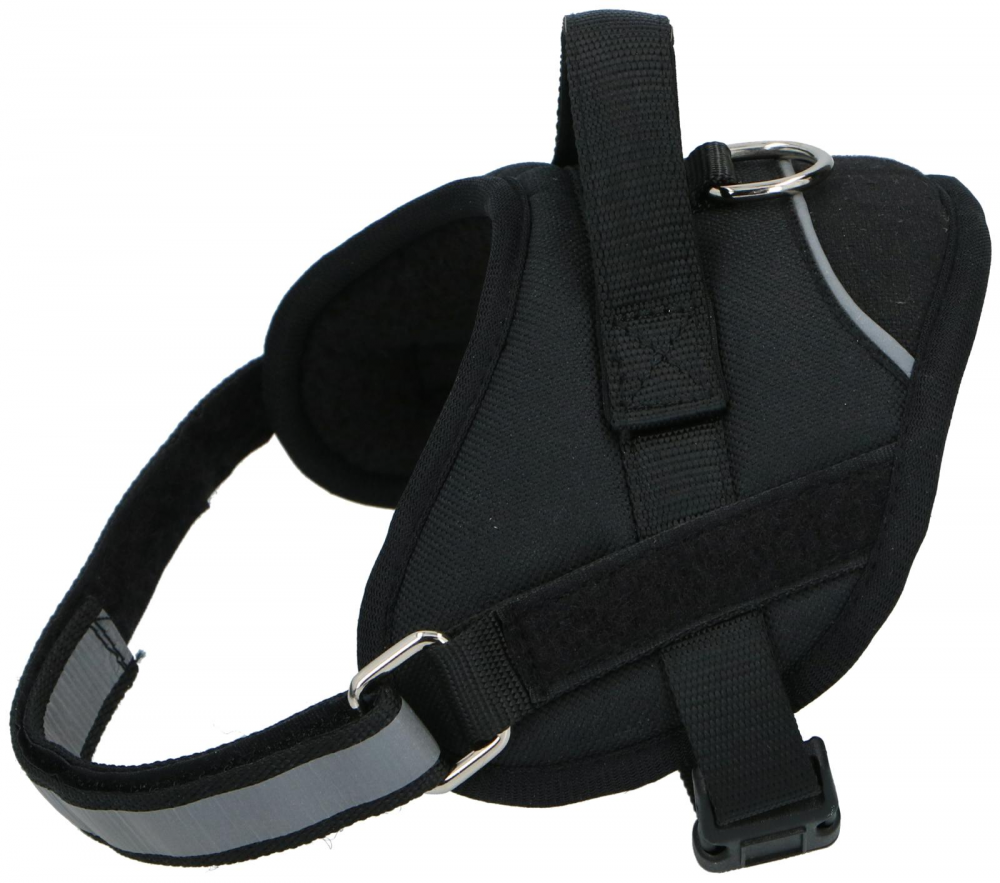 Pet Treatment kutyasétáltató hám közepes termetű kutyáknak. Kellemes, puha belsőrésszel, fényvisszaverő csíkkal, 2 oldalán tépőzárral rögzíthető feliratokkal.